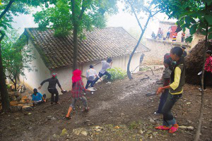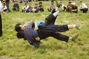 迎亲宴毕,一般都要举行摔跤比赛。先由女方家派人用酒邀请,接亲队伍应邀派出选手。在比赛中,只有把对方摔倒在地才算赢,如果双方同时倒地,则比赛无效。