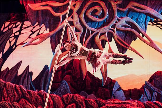 杂技艺术在剧场空间维度的呈现,一是把身体作为一种最为本质的符号材料进行直接表现;二是通过与物体、音乐、舞蹈、灯光、唱诗等的排列组合,展示技艺的身体与物体、空间的关系,达到彰显其生命意蕴与美学品质的目的。剧中网吊、绸吊、转动杆上技巧等项目非常炫技,展现了现代杂技的审美意境,诗与思在舞台上相得益彰。绸吊极具浪漫色彩,承载着轮回与终极的生命哲理;智者的“唱诗”,凸显了该剧的史诗特征,增加地域文化和远古历史的厚重感。