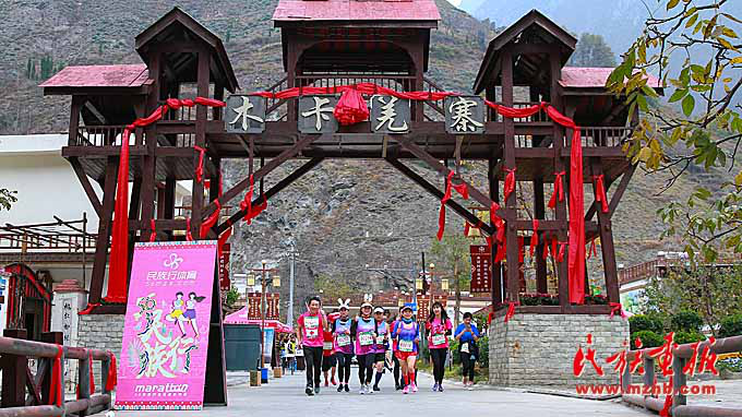 运动员经过美丽的理县木卡羌寨。