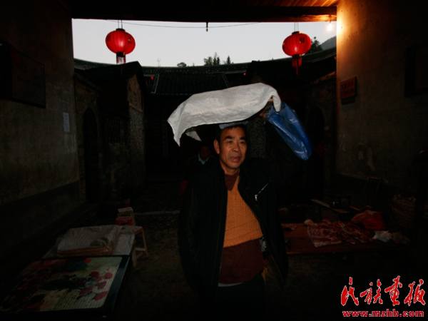 傍晚六点,江胜洪等人相继赶到承启楼祖堂。在那里,“龙”已经倚靠在墙边,静静地等待一年仅有的这几天。人们首先给龙头系上一块红布,象征吉祥。另一边,排在第11位的江斌正在往竹筒里灌煤油,做晚上上山的火把。