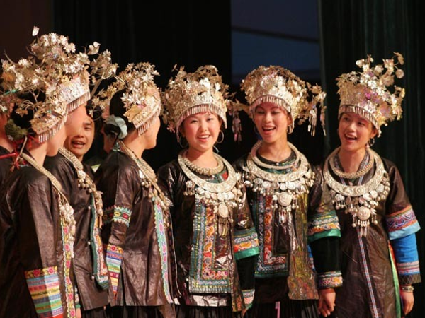 大 歌——侗语称“嘎老”(Gal Laox),“嘎”就是歌,“老”具有宏大和古老的意思。侗族大歌以“众低独高”,复调式多声部合唱为主要演唱方式。侗族大歌需要3人以上的歌班(队)才能演唱,参加演唱的人越多,效果越好。几乎每个侗寨都有歌队,有的侗寨多达10来个歌队。对歌、赛歌一般在“侗年节”、“吃新节”、“春节”等节日。更为有趣的是村与村,寨与寨举行对歌比赛活动。那时,男女青年们不断地用目光相互偷看对方,彼此含情脉脉,他们常常通过唱大歌的这种形式初识相恋,直至结下良缘。