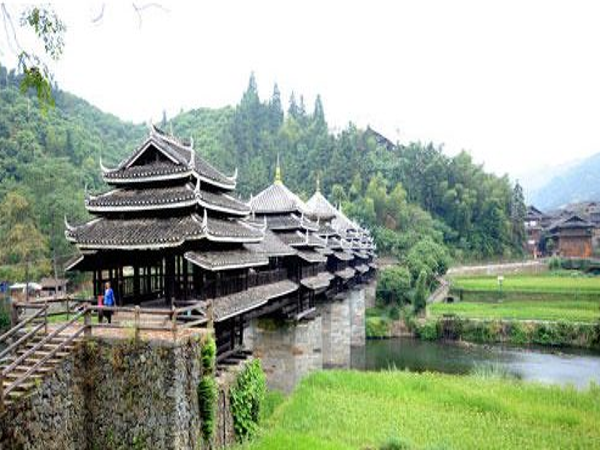 三江县在桂湘黔交界处,程阳寨在县城古宜镇北20公里,是侗族千户大寨,有马安、平寨、岩寨、平坦、懂寨、程阳大寨、平埔、吉昌等八个自然村寨,面积12.55平方公里,居民2197户共9701人。国家重点文物保护单位——举世闻名的程阳风雨桥,就座落于此程阳八寨旁的林溪河上,始建于1912年的程阳桥,是目前世界上规模最大的风雨桥。