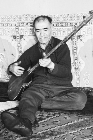 萨德克江要为笔者弹唱一曲乌孜别克族民歌《黑眼睛》。他先是拿出了一本页脚已经开裂、页边已经发黄卷曲的小册子,看了看上面所记的歌词后,方才弹唱起来。拜西热阿依解释说,她丈夫的记性不太好了,总要先看看歌词,之后才能完整地唱完一支曲子。