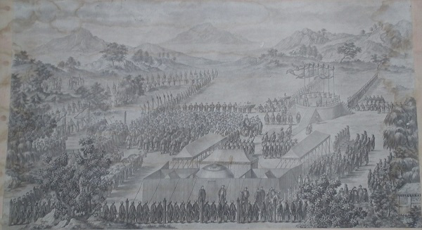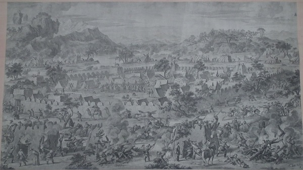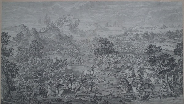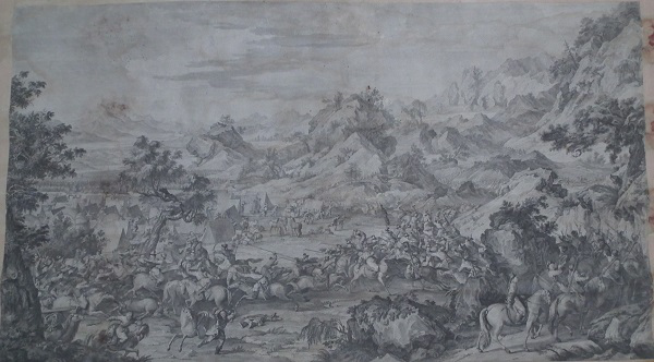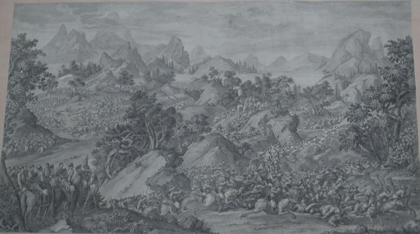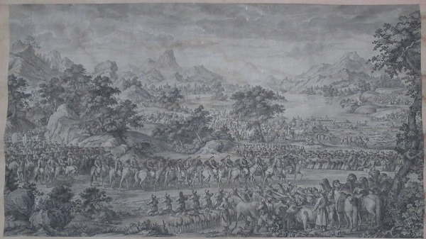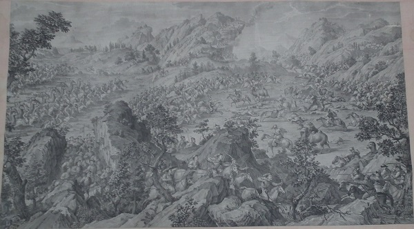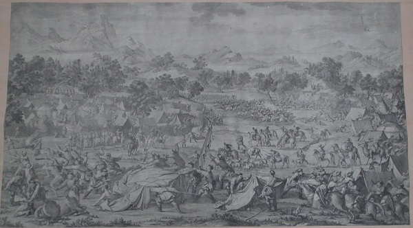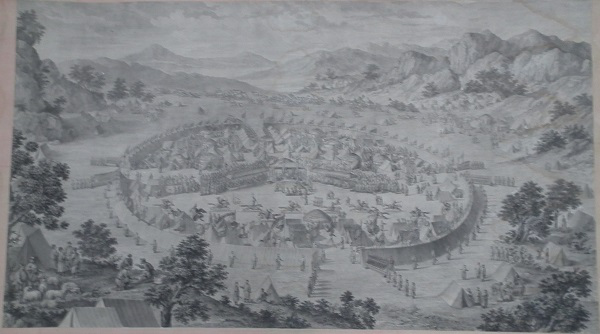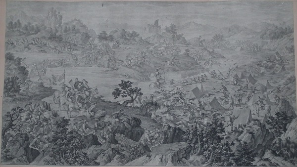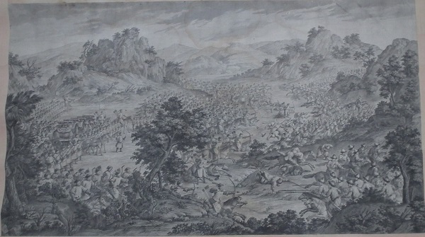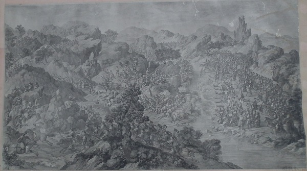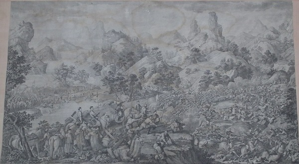 乾隆皇帝为炫耀自己的历史功绩及清军战士的英勇表现,命中外画师绘制西域战图,同时为永传后人将此画制成铜版画,形成今日的西域战图册铜版画。此战图册真实再现了当年清军平定内乱,统一疆土的宏伟场面,具有较高的艺术价值和极高的历史研究价值。