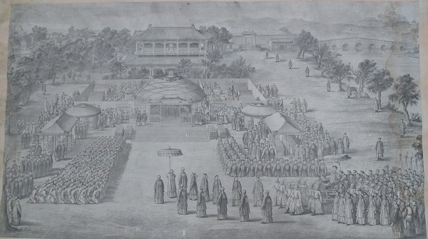第一图为《凯宴战功诸将士》,画中描绘的是西苑,紫光阁前搭了一座帐篷,弘历乘坐16人抬的肩舆,缓缓进入宴会场。文武官员及蒙古王公贵族分列两旁跪迎。帐篷两边放置了赏赐的物品,帐篷后面正在准备宴席。画面右上角为隔开中海、北海连接东西的金鳌玉栋桥,远处可见琼岛上的白塔,地域特征非常鲜明。