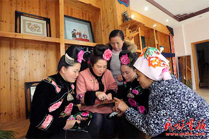 长裙苗刺绣国家级传承人杨阿妮(左二)和绣娘们交流刺绣技法