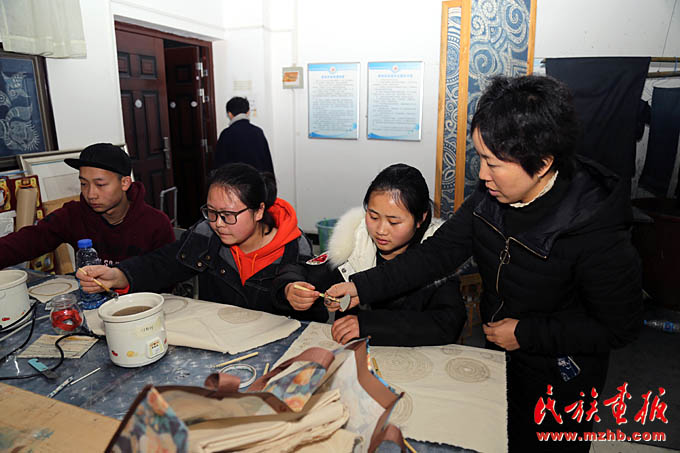 吴安丽老师(右一)在凯里学院艺术学院蜡染实训室指导学生