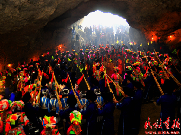 苗族同胞们身着节日盛装,在溶洞里举行“跳洞”,祭祀先祖,祈祷来年风调雨顺