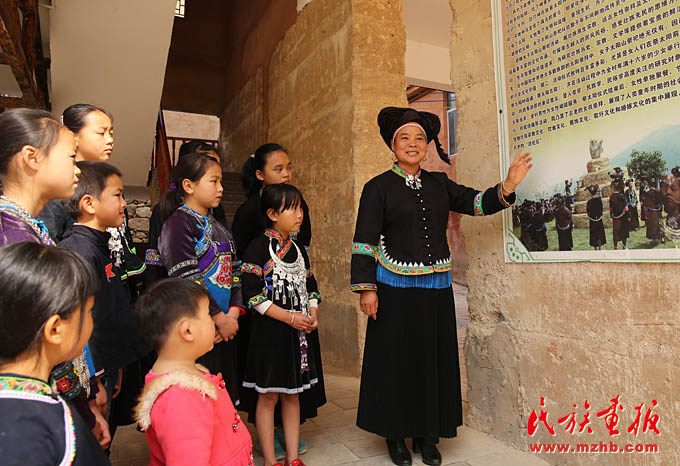 “女子太阳山祭祀”州级传承人陆顺梅(右一)带着小朋友参观“女子太阳节”展览,并为小朋友讲解壮族文化并为小朋友讲解壮族文化