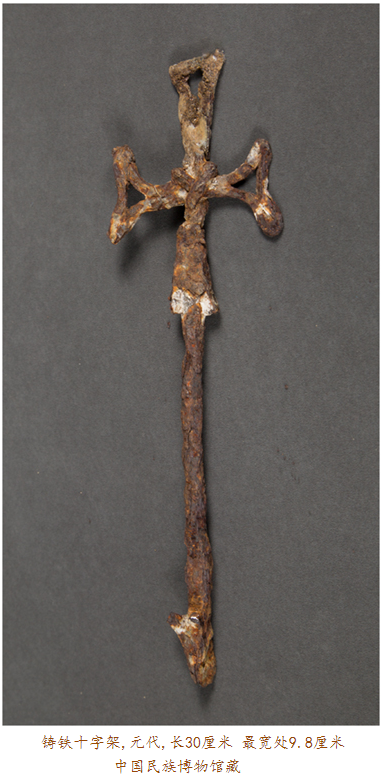 眼前此件在内蒙古达茂旗出土的元代鎏金青铜十字架,四面排列有浮雕金刚杵纹,其正面每个金刚杵图案上均有鎏金装饰,十字架上部穿孔则可用于悬挂。金刚杵是藏传佛教里的修行法器,象征力量与智慧;而十字架则是基督教文化的标志,如此混搭,历史便要传递出种种:在信仰藏传佛教的蒙古高原,金刚杵,象征无畏圆满,十字架,则代表救赎重生,东西方文化的结合亦呈现某种文明可能达到的无可比拟之高度。