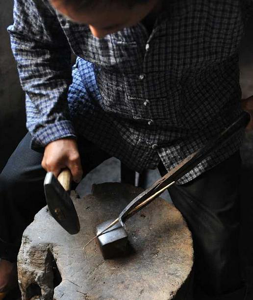 锤打:将热银锤打成四方形长条或圆柱状细条,再根据制作需要,做成片形或条形。