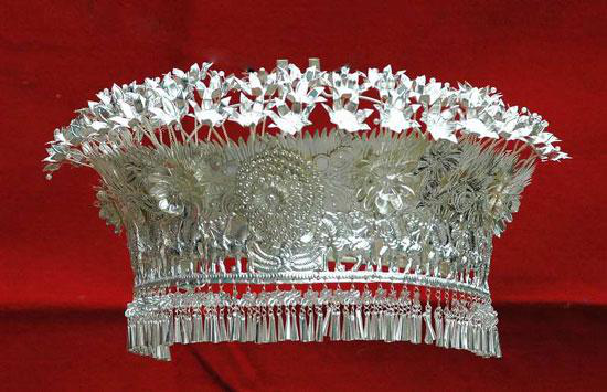 银凤冠和银花帽是头饰中的主要饰品,也是整套银饰系列之首,素有龙头凤尾之美称,其制作较为复杂,使用的小件饰品少则一百五十余件,多则达两百余件,价值昂贵。苗族银饰,如同苗族刺绣、织锦、蜡染等装饰物一样,是苗族支系相互区别的重要表征,不同地域的银饰有着不同的特征。