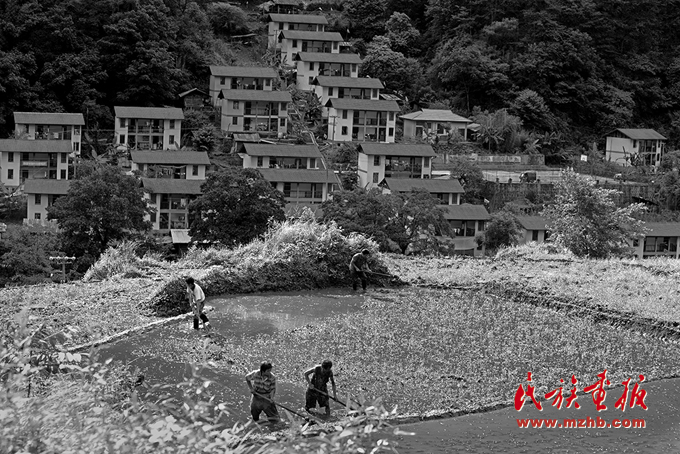 在依山而建安居房群落前独龙族村民在翻挖、平整水田