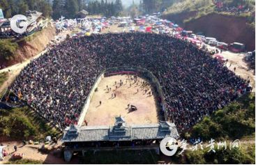 贵州省从江县第十五届原生态侗族大歌节的前一天,恰逢该县逢亥斗牛日,丙妹镇松学斗牛塘、谷坪乡四寨河斗牛塘同时举办传统牛王争霸赛,喜迎一年一度“侗族大歌节”的到来,共有来自周边村寨的80头水牯牛参战,斗牛活动场上名牛角逐,场面异彩纷呈,吸引数万名观众前来观战。