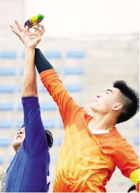 江西队选手在混合双蹴比赛中起脚击球 何五昌摄