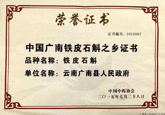2015年7月28日,广南铁皮石斛被中国中药协会授予“中国广南铁皮石斛之乡”证书。(凌垭公司提供)