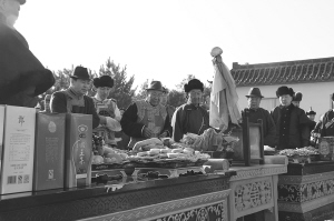白酒、点心、干果,长长的条案上,摆放着各式祭品