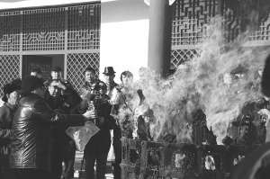 在主祭者的带领下,男人们排队走到火坛旁,一边把自己带来的白酒、黄油、羊肉等物恭敬地抛入火中,一边祷告。按照传统,女人们在所有程序都告一段落时,最后走到火坛边祭拜火神,祈福新春。