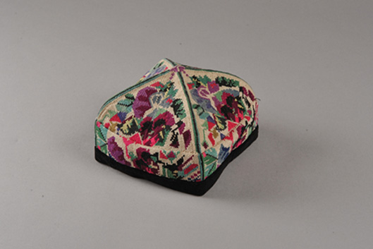 花帽,维吾尔语称为“朵帕”,收藏于民族文化宫博物馆的维吾尔族花帽来源于20世纪50年代、60年代及80年代的新疆喀什、和田、乌鲁木齐等地,有十字挑绣花帽、绿色丝线平绣花帽、男式黑色巴旦木花帽、紫红毡绒金丝线花帽、四片溅绒花帽等,涵盖了维吾尔族花帽基本款式和图案。其中最有意义的一款花帽是20世纪60年代,新疆和田地区民丰县先锋公社敬献毛泽东主席的礼物——“曼甫朵帕”。