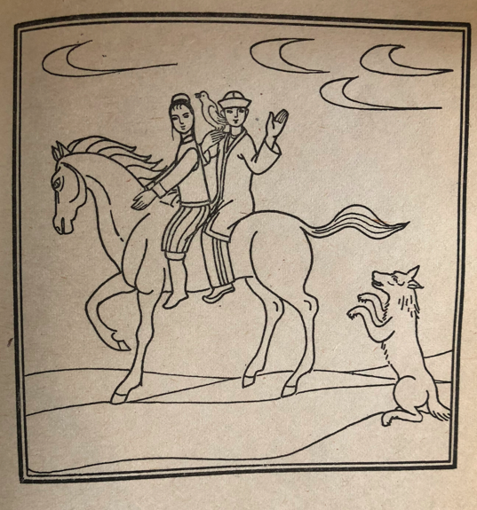 狼说了声:“现在我该走啦。”转身就走了。清晨,汗的姑娘让四十个侍女领先,又让四十个侍女随后,她领着她们正要外出游逛去。狼藏在树林后边,上去一把把汗的姑娘拉住,很快地把她带到了少年这里,让让他们俩一前一后地骑在自己背上,驮着他们飞驰而来。在路上,姑娘和这个少年彼此相爱了。少年向狼央求道:“现在我同这个姑娘已经成了永远也不能分离的一对了。可是,怎么样才能不分离呢?请你给我们想个办法好吧?”