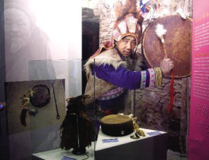 在民族文化宫的展览中,有一幅大照片——一位老释比,手拿羊皮鼓,头戴猴皮帽,表情庄严、凝重。那正是释比传人朱金龙。朱金龙这次也来到了北京,把他祖祖辈辈传下来的释比文化展现给北京的观众。