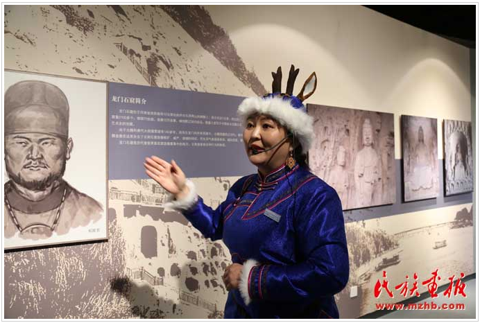 鄂伦春族讲解员在拓跋鲜卑历史博物馆讲解拓跋鲜卑历史的足迹