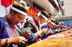 三江县同乐苗族乡举办刺绣手工限时赛,绣娘们向游客们展示传统的少数民族刺绣技艺