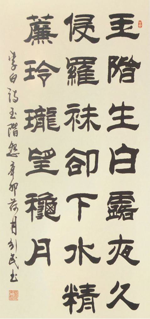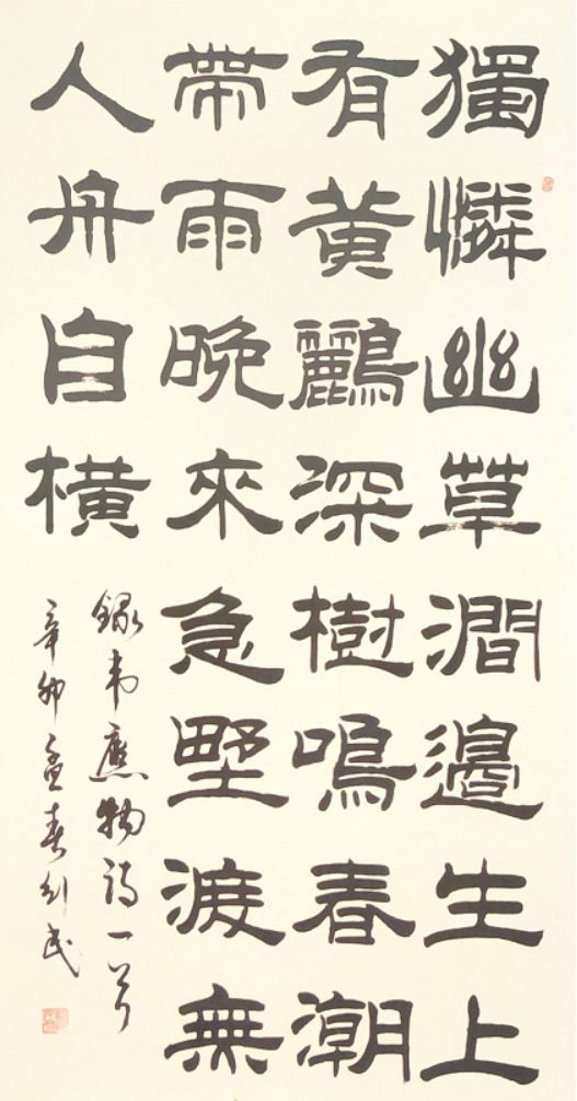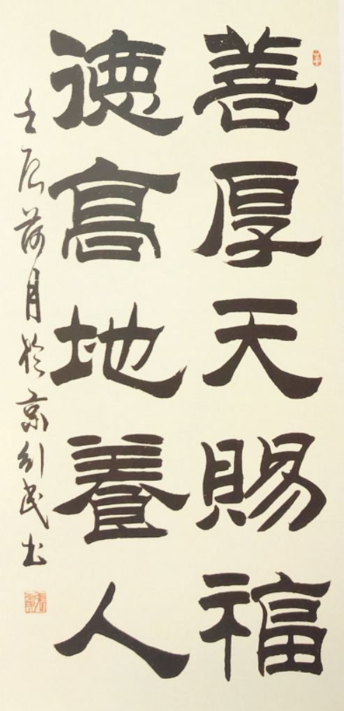 从书法观念上说,张行民属于“传统派”。在传统中国美学中,刘勰《文心雕龙》中所谓“刚健既实,辉光乃新”是最为健康的生命情调体现。“魏晋风度”的一个非常重要的审美标志就是人的“骨气”,无骨气,则算不上风度。中国艺术从它的凌空高蹈之际,就以骨为美,以气为尚。书如其人,张行民书法颇显其“骨”与“气”,他的隶书胎息于历代隶书大家的标准书风,取法与刘炳森先生的隶体风格。为领会贯通隶体的本真,他读帖临帖如醉如痴,近来参以名家的大气雍容,风流表格,经过一番整合已初显“刚健既实,真力弥满”的个性风采。从字法上讲,他取诸家“简约”之长,以魏体的凌空取势、大气超拔以补其不足。从笔法上分析,他惯用高管长锋执中守意,凌空高蹈,笔力遒逸,骨气峻迈。读他的字,可以感受到生命气象的流落、情感意绪的喷发,正是一种趋于壮美意向的审美生发。若再从点画的线性质感来看,张行民近作的最大特点是“遒劲厚重,刚健纵逸”。在创作中,情绪的激扬往往左右了他对毛笔的掌控,在控制与时空中,他完成了笔与笔的连带,线与线的绾结,因此从整体作品看来,浑然一气,毫不掩饰其一泻千里之概。