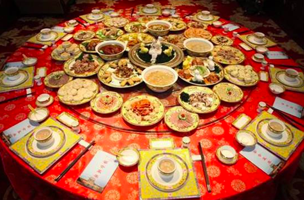 清真宴席全羊席是继满汉全席之后的宫廷大宴席之一,是清朝宫廷招待穆斯林客人的最高档次宴席。全羊席是用整个羊的各个不同部位,烹制出各种不同品名、不同口味的菜肴。也就是说,从头到尾,每一处都能做出一个菜。例如羊耳朵,可分上、中、下三段,三处可做出三样不同的菜肴:羊耳尖可做“迎风扇”,羊耳中段可做“双风翠”,羊耳根可做“龙门角”等等,品种五花八门,名称各有千秋。而且从头到尾,在所有的菜名中不露一个“羊”字,全以美丽、生动、形象的别名代之。全羊席的餐室很注重伊斯兰特色,桌布要用蓝色,还要用白布缝上“清真”二字。另外,清宫中的很多清真菜肴,现在仍为清真饭店保留,例如:桂花羊肉、葱爆羊肉、芝麻里脊、炸牛排、锅烧鸡、盐爆散丹等。还有一大批宫廷清真小吃在民间流传,如凉糕、撒糕、切糕、甑儿糕、芙蓉糕、蜂糕等。