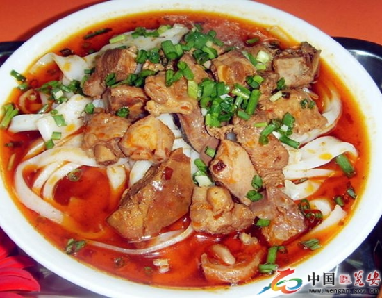 贵州瓮安辣鸡粉的制作过程非常精细。分成粉(瓮安叫“米皮”)和辣子鸡的制作,瓮安辣鸡粉作为早餐,早就名声在外,看上去红油与米粉,红白相间,相映成趣;吃起来辣香兼备,润滑爽口。瓮安辣鸡粉是黔菜中一道经典小吃。