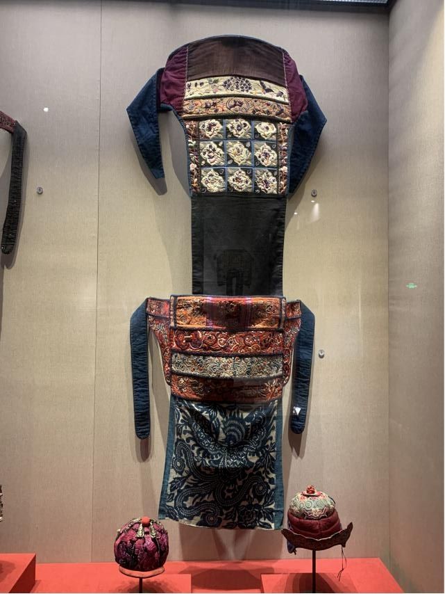 婴孩的背扇和童帽(许觊佳摄于贵州省民族博物馆)