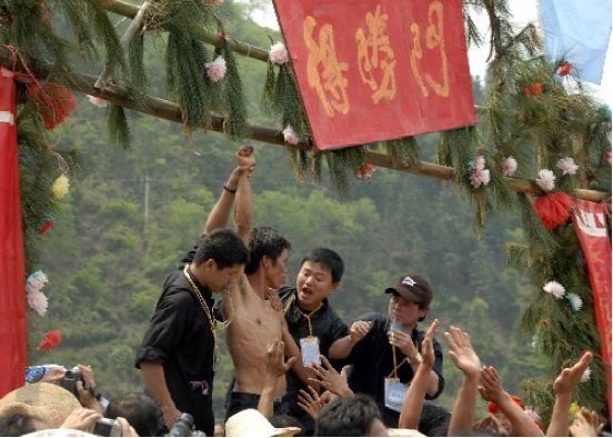 在三江县富禄乡第130届花炮节上表演苗族大木拉山