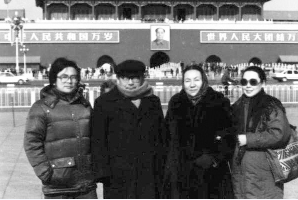 1988年,艾克拜尔(左)和夫人景宜(右)与父母在天安门前合影。