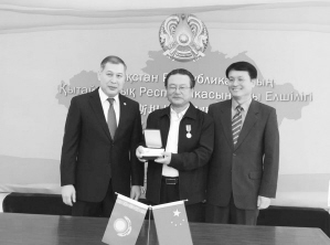 10月17日,艾克拜尔(中)被授予哈萨克斯坦外交部建立外交关系25周年金质奖章,哈萨克斯坦驻华大使沙赫拉特·努雷舍夫(左)为其颁发了奖章。