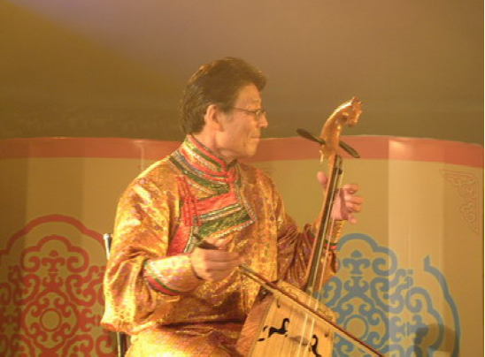 若西戈瓦在“乌兰杯”第三届中国蒙古族服装服饰艺术节闭幕会上演奏《万马奔腾》