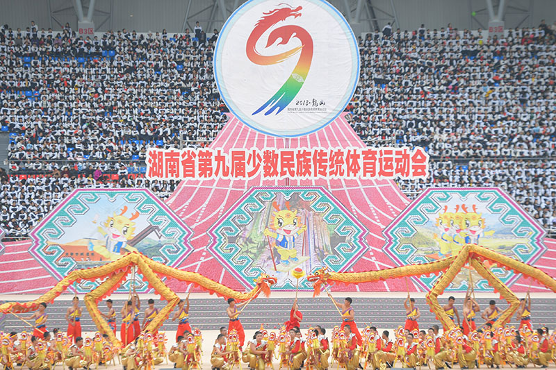 金风送爽,丹桂飘香。10月16日至20日,湖南省第九届少数民族传统体育运动会在龙山县举行。本届运动会以“龙山缘·民族情·中国梦”为主题,由省民宗委、省体育局、湘西州人民政府主办,龙山县人民政府承办,共有来自湖南省14个市州和17个民族县市区组成的31个代表团2631人参加,是湖南省历届少数民族传统体育运动会规模最大、规格最高、参赛人数最多的一次。运动会期间,来自土家、苗、瑶、侗、白、维吾尔、壮、回、汉等22个民族的1991名运动健儿角逐高脚、秋千、板鞋竞速、射弩、陀螺、蹴球、押加、毽球以及民族健身操9大项60个小项的竞赛项目以及55个表演项目。