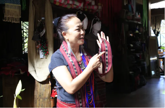 娜红是勐梭镇他朗村十组的老妇女主任,十多岁起开始学习佤族织锦技艺,随后加入了李宪兰工作室。“我靠织佤锦为家里织出了两层楼房。”娜红感恩佤锦技艺为家里带来的改变,从前是白天劳动,晚上织布,一年只能卖得2000元。现在,每个月可以拿到3000元工资,年底还有分红,日子越来越有盼头。